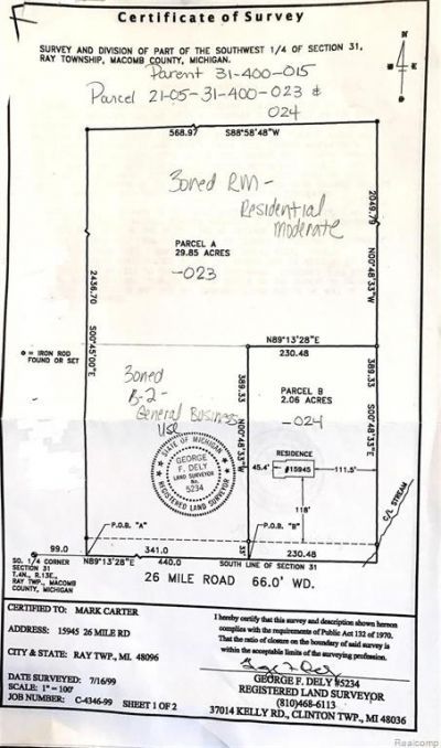 Motivated seller! Prime 29.85-acre development parcel located on 26 Mile Rd with approx. 341’ frontage. Zoned B-2 (Commercial) in the front and RM (Multifamily) in the rear, offering flexibility for mixed-use or residential development. Up to 4 splits available. Located within desirable Utica Community Schools district and surrounded by strong residential growth, including Villagio subdivision across the street with homes starting in the $900s. Convenient proximity to major retailers including Kroger, Chase, and dining. Sewer not available; municipal water through Washington Twp may be possible (buyer to verify). Ray Twp offers VERY LOW TAXES and strong income demographics. Seller will consider Land Contract terms for qualified buyers. Great investment/development opportunity!