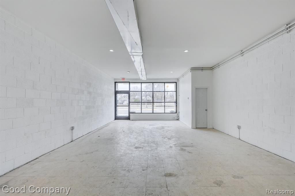 Fantastic commercial lease opportunity in Hazel Park right on high-traffic John R Road, next door to the renowned Mabel Gray restaurant and the new Bar Gabi — a true blank canvas ready for your vision. The striking two-story white brick building features a bold wall of floor-to-ceiling black-framed windows at the front, flooding the spacious main floor retail/commercial area with natural light and giving it serious street presence. Inside, the wide-open main space offers tons of flexible room to work with, white painted block walls, recessed lighting, and exposed ductwork that lends an industrial-cool vibe perfect for a variety of uses. Toward the rear of the space you'll find a convenient half bath, a dedicated utility/storage room housing mechanical systems, and a rear exit. Out back, there's a private rear entry shared with just a couple of neighboring tenants, plus a generous paved parking lot with multiple spots — a huge bonus on a busy corridor like this. Located steps from one of the area's hottest dining destinations, surrounded by an energetic mix of local businesses, and with high daily traffic counts, this is a rare chance to plant your flag in one of metro Detroit's most buzzed-about commercial strips. Minimum 5-year lease. Welcome Home!