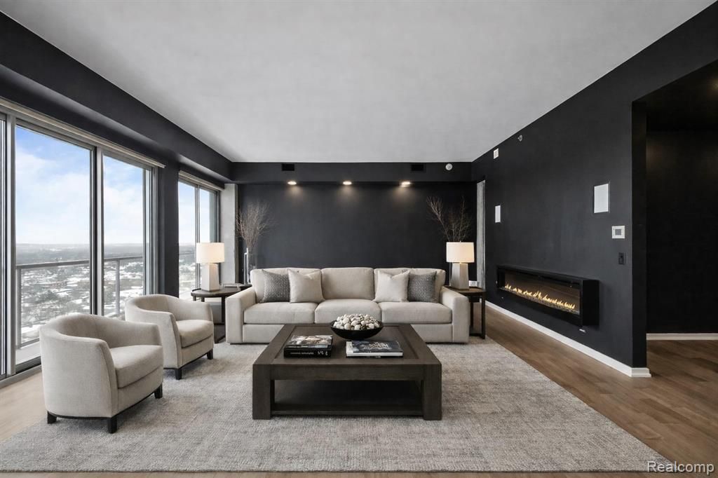 Positioned on the 18th floor, this refined residence delivers elevated urban living with panoramic city views framed by floor-to-ceiling glass. The expansive open-concept living and dining areas showcase wide-plank flooring, a sleek linear fireplace, custom lighting, and direct access to a private balcony—creating a seamless blend of comfort and contemporary design. The kitchen is thoughtfully appointed with modern flat-panel cabinetry, granite countertops, premium stainless steel appliances including double wall ovens and a gas cooktop, a vented hood, and an oversized peninsula with seating. A separate breakfast nook offers additional flexibility for casual dining or a dedicated workspace. The primary suite is designed for privacy and comfort, featuring a generous walk-in closet and a well-appointed bath with dual vanities, a soaking tub, and a separate shower. A second bedroom and full bath provide ideal accommodations for guests or a home office. A defined foyer and ample storage complete the functional layout. Clean architectural lines, upscale finishes, and an exceptional downtown location define this luxury condominium in the heart of Royal Oak.