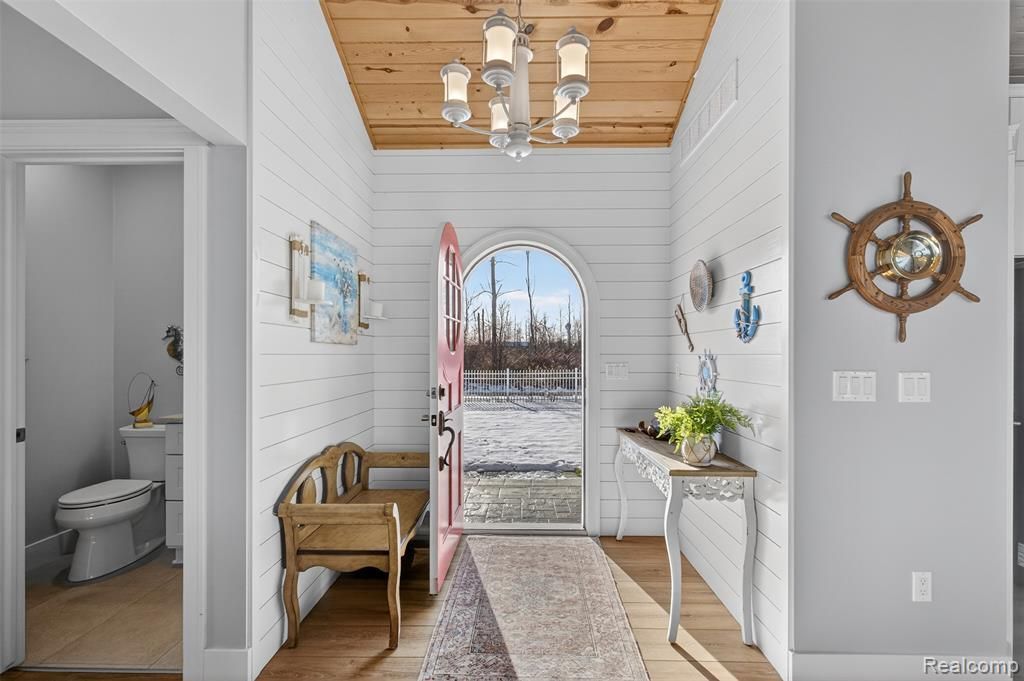 Nearly new, built in 2022, this stunning single-floor home sits on two lots totaling 4.66 acres in the prestigious Shorefront Condominium Estates of Port Hope, Michigan. Featuring white maintenance-free siding, a fade-resistant blue metal roof, and two decorative dormers, this 1,906 sq. ft. home offers an open, vaulted knotty pine ceiling with recessed lighting and beam in the kitchen and living area, highlighted by a large white stone wood-burning fireplace. Light-colored, scratch-resistant laminate floors flow throughout, with tile in the bathrooms. Two spacious bedrooms (17’x17’ and 14’x17’) each feature walk-in closets and attached baths with tub and rainfall shower. Glass sliding doors from the bedrooms and living room open onto the lakeside deck, providing panoramic views of Lake Huron. Most of the lakeside wall is windows, filling the home with natural light and showcasing spectacular skies. The property includes a fully insulated 3-car garage with sparkled epoxy flooring, stamped concrete driveway and decks, custom interior doors, upgraded molding, and a striking red front door. Enjoy a gated property with electric gates, bronze eagle pillars, an engineered limestone seawall, fenced yard with weeping birch trees, sod lawn with sprinkler system, and full-house Generac generator. All furnishings, outdoor furniture, yard equipment, a canoe, and a paddle boat with life vests are included. Relax on the covered lakeside deck to watch sunrises, eagles, geese, swans, and other wildlife, or unwind on the roadside deck overlooking the woods and deer. HOA dues are $300 per lot annually. This exceptional home blends luxury, comfort, and nature with endless outdoor and lakefront enjoyment. Don’t miss the chance to make this lakefront paradise yours—schedule your private showing today!