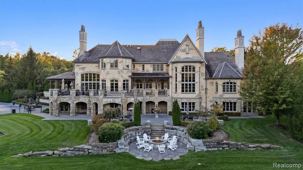 Live the lifestyle of a private retreat in this extraordinary French Normandy estate set on nearly four acres within one of Oakland County’s most exclusive gated enclaves. Spanning about fourteen thousand sqft, this residence blends timeless European craftsmanship w/ modern sophistication. A grand barrel-ceiling foyer w/ sweeping wrought-iron staircase reveals exquisite details—from custom millwork & ironwork to rich wood, stone, & onyx finishes. The two-story library w/ limestone fireplace & spiral staircase is a showcase of artistry and design. The chef’s kitchen by Bella Cucina with Downsview cabinetry offers dual islands, hammered copper sinks, Wolf & Sub-Zero appliances, walk-in pantry, & breakfast nook overlooking the pond & fountain. Butler’s pantry & circular wine cellar connect seamlessly to the dining room & entertaining areas. The family room w/ carved stone fireplace opens to terraces, creating an easy indoor-outdoor flow for entertaining or relaxation. The main floor luxurious primary retreat offers dual dressing closets, sitting area, gas fireplace, & private office. The spa-inspired bath features heated floors, onyx countertops, & dual water closets. Upstairs are private bedroom suites & a separate in-law or au pair apartment w/ a full kitchen. The lower level is an entertainer’s dream with a full bar, golf simulator, billiards area, fitness room, locker room with steam & sauna, wine tasting room, a glass conservatory & spa with indoor hot tub opening to the terrace. Additional amenities include an elevator, whole-house generator, Sonos sound system, state-of-the-art security, five fireplaces, six-car radiant heated garage, & full home automation. The grounds offer multiple terraces, a pergola, natural gas fire pit, lush landscaping, a magnificent pond & fountain with tranquil views, & a resort-style saltwater pool, creating a peaceful, private, resort-like setting. This residence embodies timeless elegance, privacy & craftsmanship-a true masterpiece.