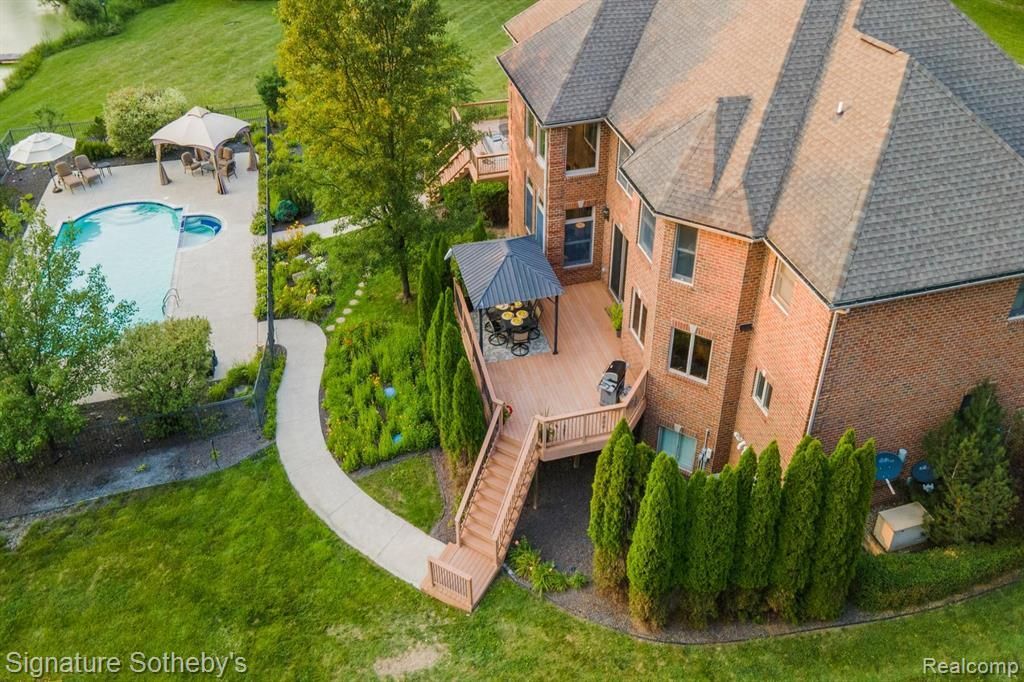 Custom-built brick and stone estate offering approximately 6,800 square feet of refined living space, including a beautifully finished lower level, all set on 11 private acres. This light-filled home showcases exceptional craftsmanship, high-end finishes, and a thoughtfully designed floor plan ideal for both everyday living and elegant entertaining. The main level features a grand great room with gas fireplace, a gourmet kitchen with oversized granite island and beverage bar, formal living and dining rooms, a private office (or optional sixth bedroom), four-season sunroom, and full amenities including laundry and baths. Upstairs, the luxurious primary suite offers a massive walk-in closet and private bonus room, complemented by a princess suite and additional bedrooms with a Jack-and-Jill bath and abundant storage. The finished lower level impresses with a large family and game room, spectacular wet bar, fifth bedroom, full bath, and ample storage. Outdoors, the property transforms into a private resort featuring an in-ground pool with spa bubbler, expansive patio, wraparound porch, and pergola-covered deck—all surrounded by mature landscaping, seasonal gardens, a private pond, and scenic trails. A 40x60 all-brick outbuilding with loft and RV bay provides exceptional versatility for cars, hobbies, or storage. Located in Cobblestone Farms with access to two miles of private walking trails, this estate offers rare privacy, space, and sophistication—truly a complete luxury retreat.