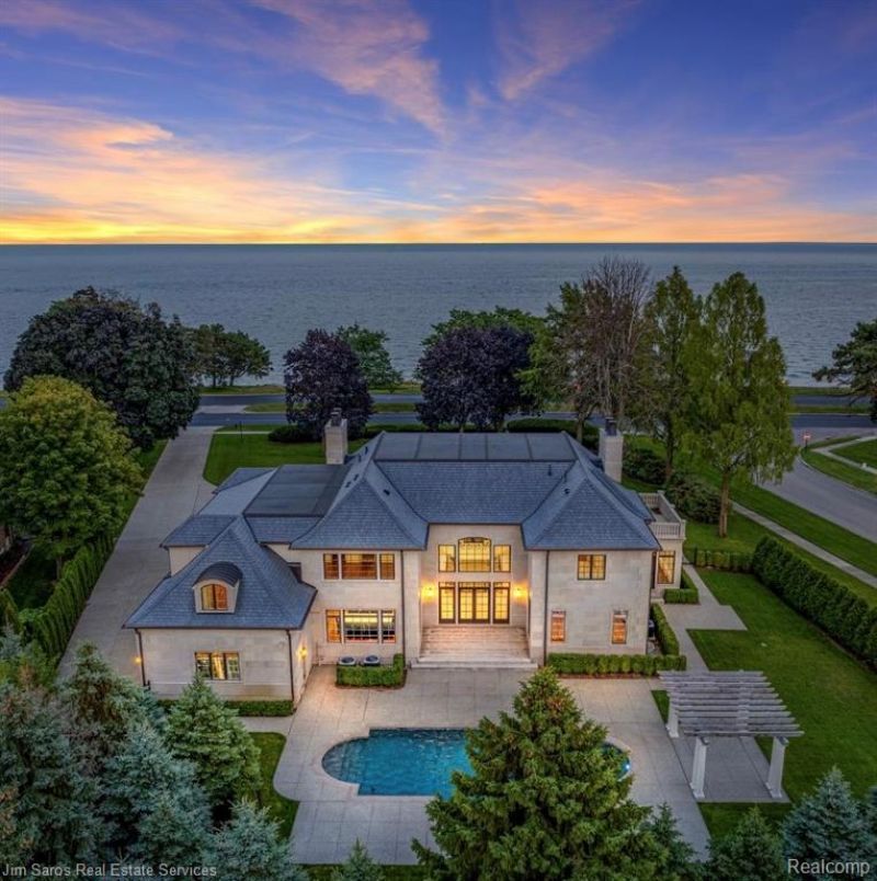 Welcome to 707 Lake Shore — a custom-built estate that stands in a class of its own. Completed in 2021, this extraordinary residence evokes the romance of a pre-war limestone manor while delivering every modern luxury expected in new construction. Perfectly positioned along the open waters of Lake St. Clair, the home offers breathtaking water views from every principal room. The exterior is clad in hand-cut Indiana limestone & crowned with a DaVinci slate roof. Marvin Ultimate windows & doors frame panoramic water views, & a cobblestone motor court welcomes guests in timeless fashion. Inside, a dramatic foyer features imported marble flooring, soaring ceilings, custom millwork, and a coffered ceiling. A sweeping staircase with custom iron railings connects all levels. The Downsview chef’s kitchen flows seamlessly into the family room with lake views and includes dual Sub-Zero refrigerators and freezers, a Wolf 8-burner ranger, Wolf oven, warming drawer & pantry. A private first-floor den wrapped in custom knotty alder overlooks the backyard. A heated 4-car garage connects to a functional mudroom with additional laundry and storage. Upstairs, the primary suite offers water views, fireplace, terrace, elevator access, dual custom walk-in closets, and a spa-inspired bath. 4 additional bedrooms with walk-in closets, 3 full baths, 2nd floor laundry, guest kitchenette, and rear staircase complete the level. The finished lower level provides expansive entertaining space, storage, a bedroom with egress, full bath, workout room, and half bath. Set on over an acre, the grounds feature a saltwater PebbleTec pool with limestone coping, expansive patio and pergola, and mature transplanted spruce trees creating exceptional privacy. Additional highlights: 3-floor elevator, add. lower-level bedroom, 5 full and 3 half baths, 7’ solid-core doors, heated 4-car garage with EV-ready plug, and generator prep. A rare one-of-one offering on Lake St. Clair! Add. Photos to follow.