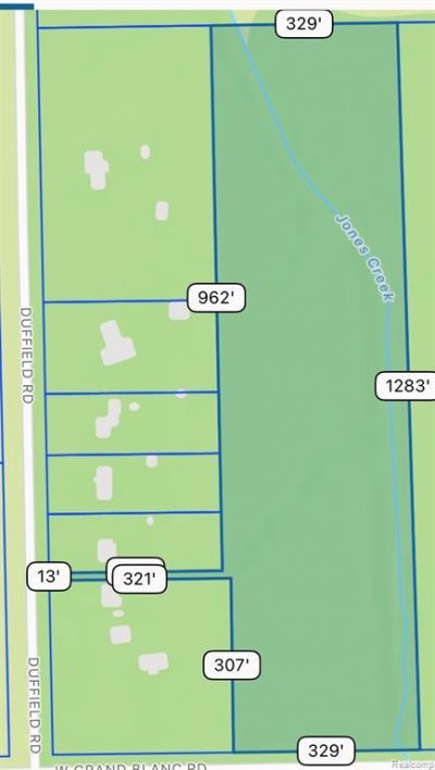 Discover a rare opportunity in Gaines Township with approximately 1,350 feet of Jones Creek frontage winding along the eastern boundary of the property. This scenic parcel offers a peaceful setting with mature trees, abundant wildlife and the soothing presence of flowing water. With frontage on Grand Blanc Road and Duffield Road with a layout that provides both privacy and accessibility, the land is well suited for a private estate, recreational use, or future development (subject to township approval). A unique combination of acreage, water frontage, and location. Opportunities like his are seldom available!